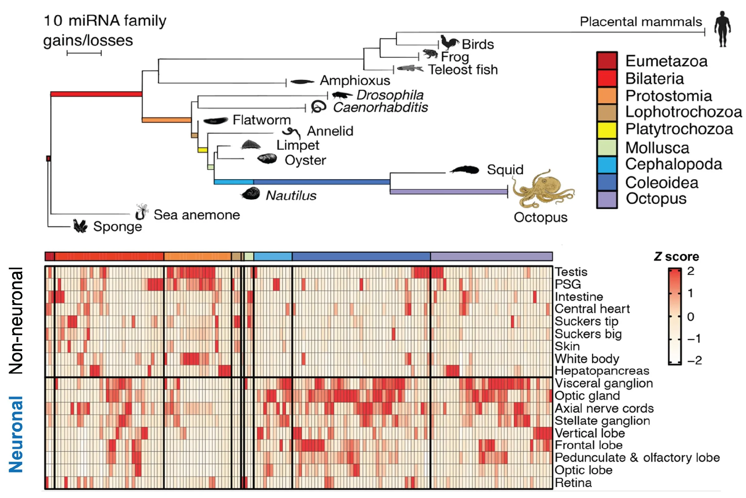 Figure 2. Emergence of new microRNA families. Rapid expansion of the microRNA repertoire in animals with large brains, such as primates and octopi (top). The majority of new microRNA families emerged in the octopus’ neuronal tissue (bottom). Adapted from Zolatorov et al. 2022.