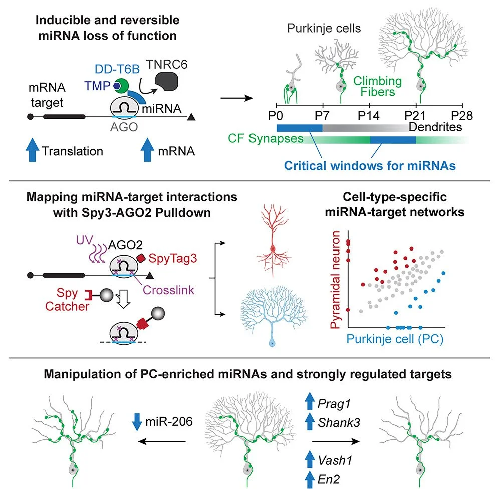 Figure 4. Dissecting microRNAs roles critical for brain development. Top: We engineered technologies with vastly improved spatiotemporal resolution that allow the dissection of cell-type-specific miRNA-target networks. Fast and reversible miRNA loss of function showed that miRNAs are necessary for Purkinje cell (PC) differentiation, which previously appeared to be miRNA independent, and identified distinct critical miRNA windows for dendritogenesis and climbing fiber synaptogenesis, structural features defining PC identity. Middle: Using new mouse models that enable miRNA-target network mapping in rare cell types, we uncovered PC-specific post-transcriptional programs. Bottom: Manipulation of these programs revealed that the PC-enriched miR-206 and targets Shank3, Prag1, En2, and Vash1, which are uniquely repressed in PCs, are critical regulators of PC-specific dendritogenesis and synaptogenesis