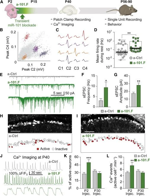 Figure 3. Transitory MiR-101 Inhibition Early in Development Induces Hyper-excitable Networks in the Young Adult. A. Schematic of the time course for miR-101 inhibition in vivo (green) and follow-up tests to assess consequences. B-C. Single-unit recordings from the hippocampus in freely behaving mice. D. Mean spike rates for single units in a-101.F- versus a-Ctrl-treated mice. E-G. sEPSC recordings in acute slices showing increased spontaneous excitatory activity in a-101.F-treated neurons. Spontaneous high-frequency burst discharges were seen in half of the slices from a-101.F-treated animals. H–L. Confocal imaging of spontaneous calcium transients on P40 showing increases in event frequency (center) and prolonged transients (bottom) in a-101.F-treated animals. From Lippi, Neuron 2016.
