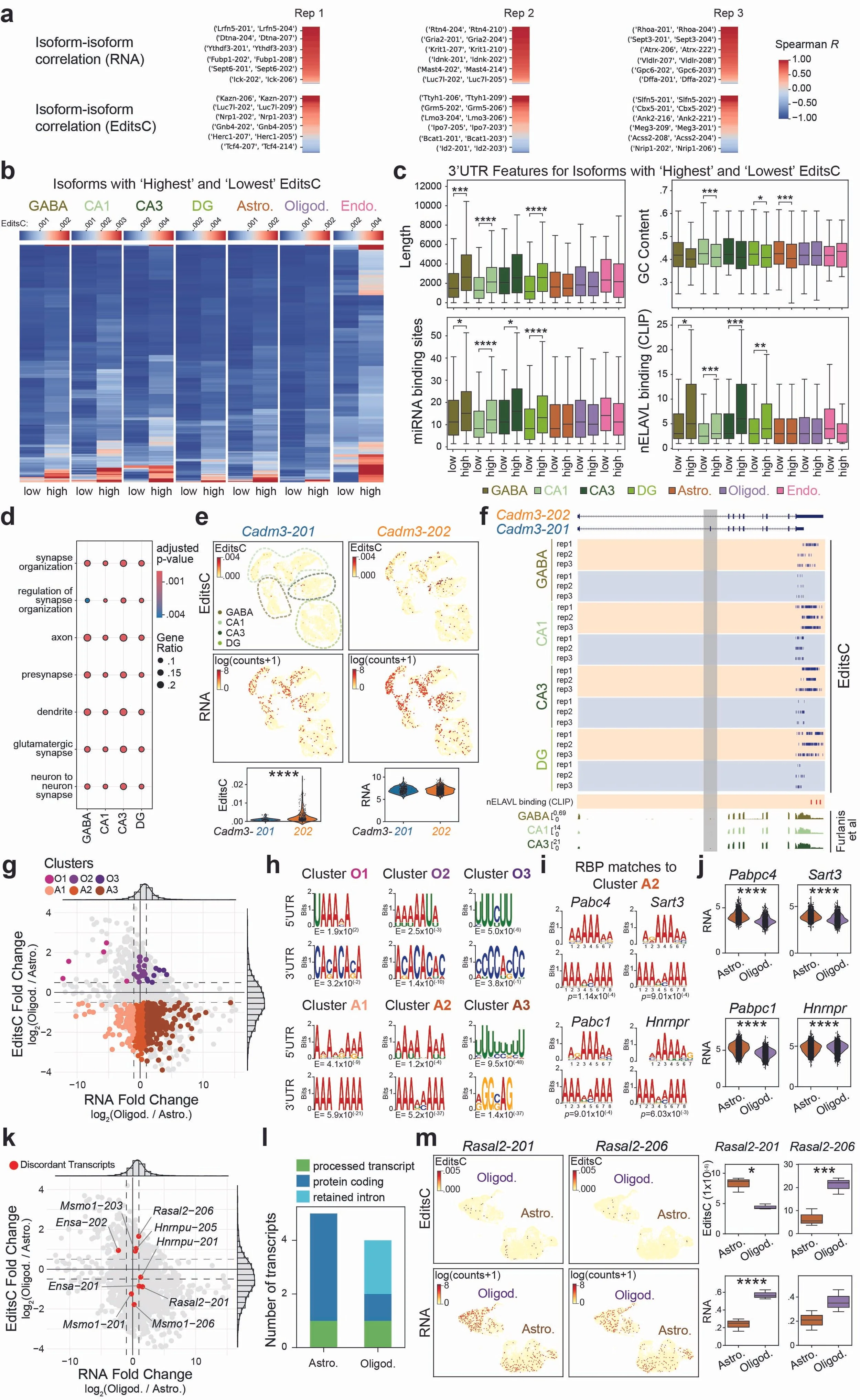 Figure 1. Ribo-STAMP paired with long-read scRNA-seq measures the translational potential of different isoforms. A. RNA counts and EditsC pairwise Spearman correlations between isoforms from the same gene across cell types. B. EditsC for isoforms from the same gene with highest and lowest translation. C. Transcript feature analyses of 3′ UTRs from transcripts in B. D. Gene Ontology analysis of transcripts in B for neuronal cell types. All ontologies were selected. E. EditsC and RNA UMAPs (top) and quantifications (bottom) for isoforms Cadm3-201 and Cadm3-202. F. IGV browser tracks showing edits detected on Cadm3-201 (blue) and Cadm3-202 (orange) isoforms. nELAVL CLIP binding sites highlighted in red. Tracks from RiboTag (bottom). Cadm3-202-specific exon is highlighted in grey. G. Differential EditsC and RNA expression analysis for Oligod. versus Astro. H. Top enriched motifs found in each cluster. I. Example RBPs enriched motifs on 3′ UTR top enriched motif in cluster A2. J. RNA expression of RBPs found in I in Oligod. and Astro. K. Same scatterplot as in G highlighting isoforms of the same gene undergoing significant differential translation in Oligod. versus Astro. L. Transcript biotypes of isoforms in K regardless of P-value. M. EditsC and RNA UMAPs (left) and quantifications (right) for isoforms Rasal2-201 and Rasal2-206.